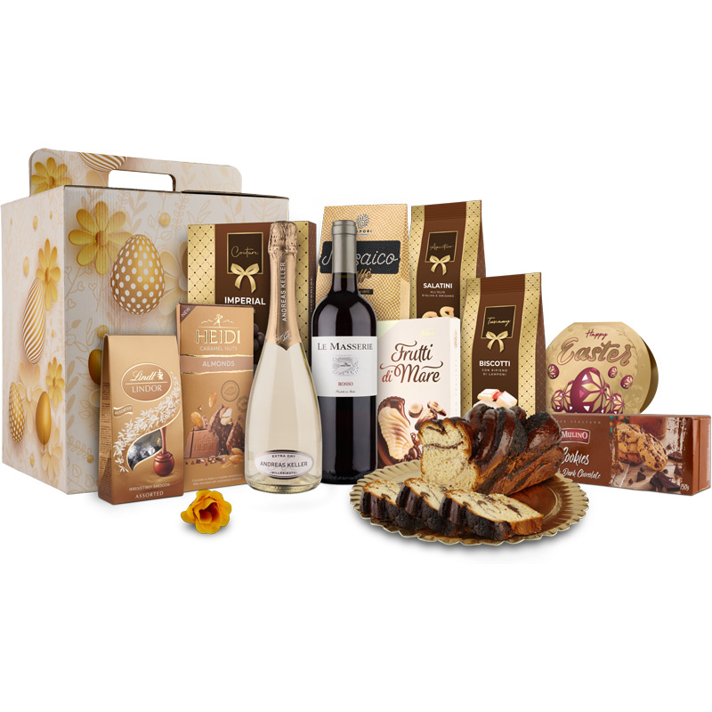 1. Spumant extradry Millesimato Andreas Keller /2. Vin roșu "Le Masserie" /3. Praline asortate de ciocolată Lindt Lindor 74g /4. Heidi Ciocolată cu lapte și migdale caramelizate 80g /5. Praline Vobro Frutti di mare 90gr /6. Cafea prăjită și măcinată Caffe Mosaico 100 g /7. Biscuiți cu ciocolată neagră Mulino di Floriano 150g /8. Covrigei cu ulei de măsline si oregano Aperitivo 100 g /9. Fursecuri cu umplutură de zmeură Tuscany 100 g /10. Praline de ciocolată Imperial 72 g /11. Praline fine de ciocolată, 24g /12. Cutie Cadou