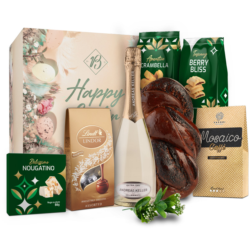 1. Spumant extradry Millesimato Andreas Keller /2. Cozonac cu nucă Velpitar 400g /3. Praline asortate de ciocolată Lindt Lindor 74g /4. Cafea prăjită și măcinată Caffe Mosaico 100 g /5. Nuga cu alune Nugatino Dolcissimo 50g /6. Fursecuri cu umplutură de zmeură Berry BlissTuscany 100g /7. Covrigei cu ulei de măsline, vin si oregano Crambella Aperitivo 100g /8. Cutie cadou