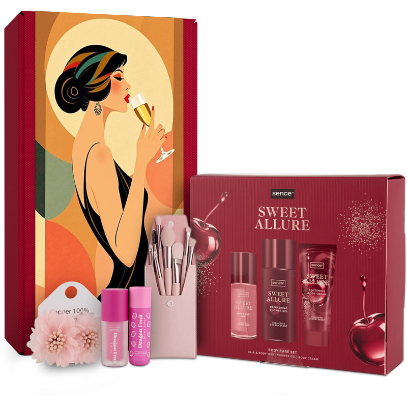 1. Set pensule machiaj /2. Set de buze balsam și scrub /3. Cercei /4. Casetă cadou 3 piese, Seductive Cherry Sent /5. Cutie cadou