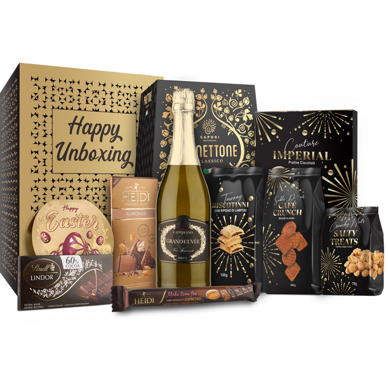 1. Spumant Brut Campiano 75cl /2. Panettone cu stafide și coajă de portocală in cutie festivă SantAngelo 500g /3. Tabletă de ciocolată 60% cacao Lindt Lindor 100g /4. Heidi Ciocolată cu lapte și migdale caramelizate 80g /5. Heidi baton cu umplutură de cafea și caramel 37g /6. Praline fine de ciocolată, 24g /7. Fursecuri cu umplutură de zmeură Biscotinni Tuscany 100g /8. Biscuiți cu cacao Café Crunch Sable D'or 100g /9. Arahide prajite și sărate Salty Treats 70g /10. Praline de ciocolată Imperial Couture 72g /11. Cutie Cadou