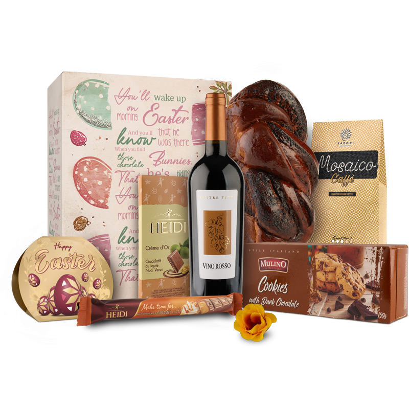 1. Vin roșu Nostre Terre 75cl /2. Cozonac cu nucă Velpitar 400g /3. Cafea prăjită și măcinată Caffe Mosaico 100 g /4. Heidi Ciocolată cu lapte și migdale caramelizate 80g /5. Heidi baton cu umplutură de cafea și caramel 37g /6. Biscuiți cu ciocolată neagră Mulino di Floriano 150g /7. Praline fine de ciocolată, 24g /8. Cutie cadou
