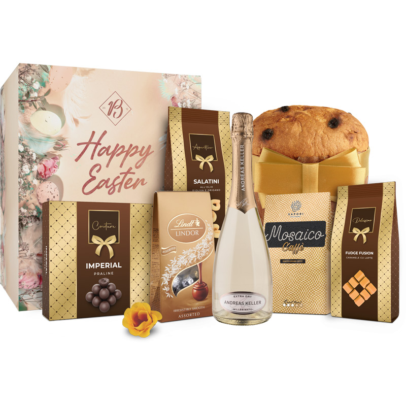 1. Spumant extradry Millesimato Andreas Keller /2. Panettone cu stafide și coajă de portocală SantAngelo 500g /3. Praline asortate de ciocolată Lindt Lindor 74g /4. Cafea prăjită și măcinată Caffe Mosaico 100 g /5. Caramele Fudge cu lapte Dolcissimo 96g /6. Covrigei cu ulei de măsline si oregano Aperitivo 100 g /7. Praline de ciocolată Imperial 72 g /8. Cutie cadou