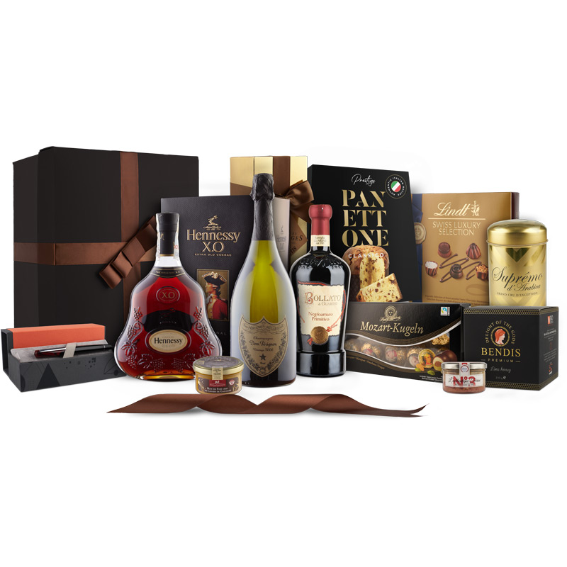 1. Cognac Hennessy XO 70cl /2. Șampanie Dom Perignon Blanc 75cl /3. Stilou Tibaldi /4. Panettone Prestige cu coajă de portocală si stafide 500g /5. Terină diverse sortimente Ducs du Gascogne 130g /6. Bloc de Foie Gras de rață Ducs de Gascogne 80g /7. Miere Premium Biogetica 240g /8. Cafea Suprermo Arabica 250g /9. Bollato - Negroamaro Primitivo Puglia 14.5% 75cl /10. Bomboane de ciocolată asortata Chevalier D'Argouges 185g /11. Bomboane Mozart cu marțipan în ciocolată neagră 200g /12. Lindt praline SWISS LUXURY 143g /13. Cutie cadou
