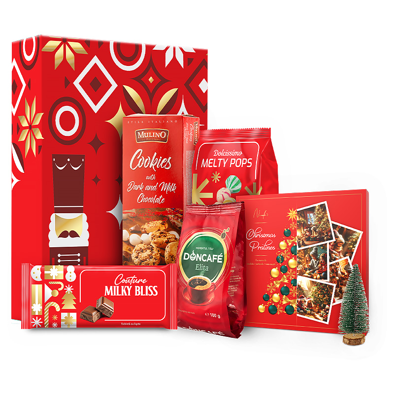 1. Melty Pops bomboane fulgi cu aromă de fructe 70g /2. Biscuiți cu ciocolată neagră și ciocolată cu lapte Mulino di Floriano 150g /3. Tabletă cu lapte MilkyBliss Couture 80g /4. Cafea Don Cafe Elita 100g /5. Bomboane de pom Christmas Pralines 100g /6. Decorațiune brăduț /7. Cutie cadou