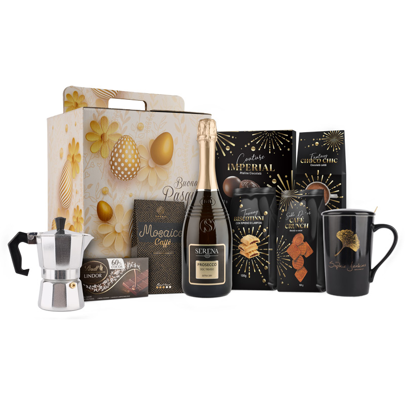 1. Prosecco Serena Wines 1881 DOC Extra Dry 75cl /2. Espressor Cafea Mokka /3. Set elegant cană și linguriță /4. Ciocolată caldă Choco Chic Fantasy 3*25g /5. Cafea prăjită și măcinată Caffe Mosaico 100 g /6. Fursecuri cu umplutură de zmeură Biscotinni Tuscany 100g /7. Biscuiți cu cacao Café Crunch Sable D'or 100g /8. Tabletă de ciocolată 60% cacao Lindt Lindor 100g /9. Praline de ciocolată Imperial Couture 72g /10. Cutiec cadou