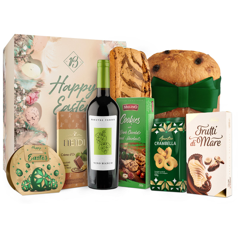 1. Panettone cu stafide și coajă de portocală SantAngelo 500g /2. Chec cu cacao 350g /3. Vin alb Nostre Terre 75cl /4. Heidi Crème d'Or, ciocolată cu lapte și nuci verzi, 90 g /5. Praline Vobro Frutti di mare 90gr /6. Biscuiți cu ciocolată neagră și alune Mulino di Floriano 150g /7. Covrigei cu ulei de măsline, vin si oregano Crambella Aperitivo 100g /8. Praline fine de ciocolată, 24g /9. Cutie cadou